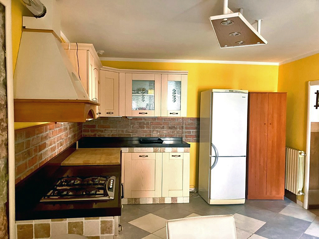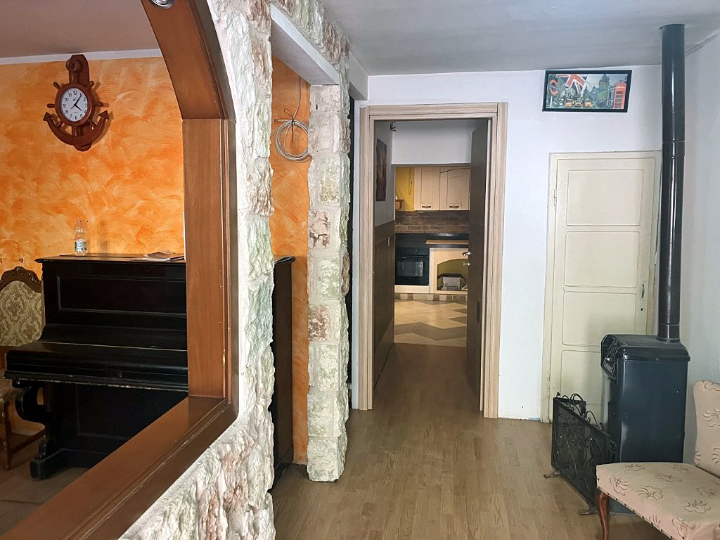 Das Erdgeschoss besteht aus einer Eingangshalle; einem Zimmer, das als Wohnzimmer genutzt wird; einem Badezimmer, das teilweise im Keller liegt und Zugang zum ersten Stock hat; einer großen Küche mit Balkon, der auf den Hof einer anderen Immobilie blickt.